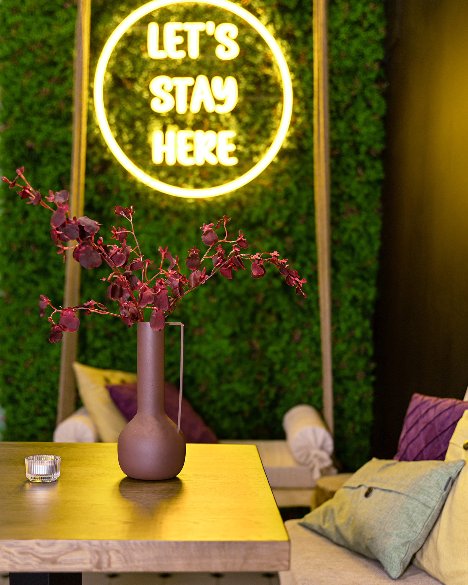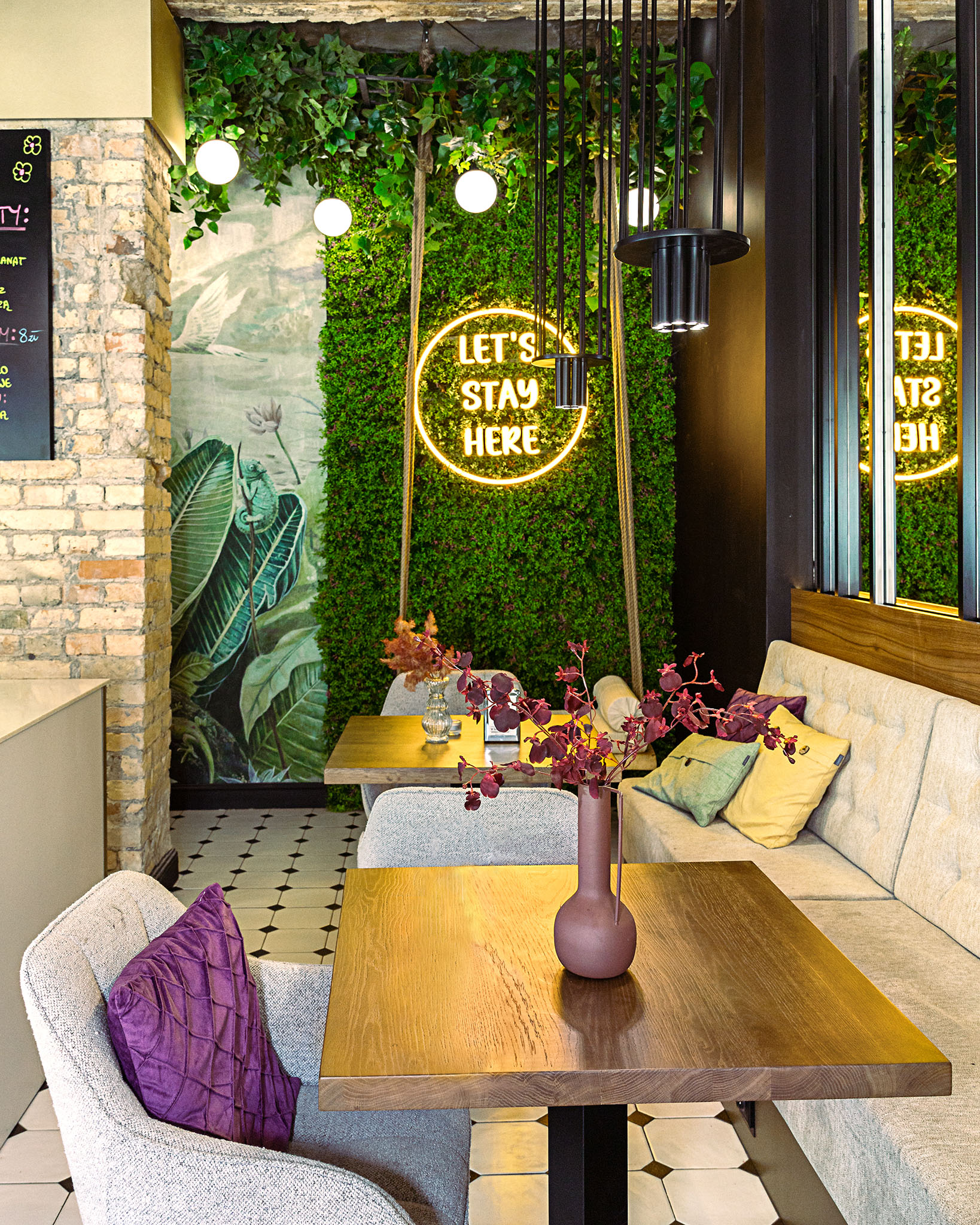 • Kolorystyka: Połączenie naturalnych barw (cegła, orzechowe drewno) z intensywnymi akcentami fioletu.