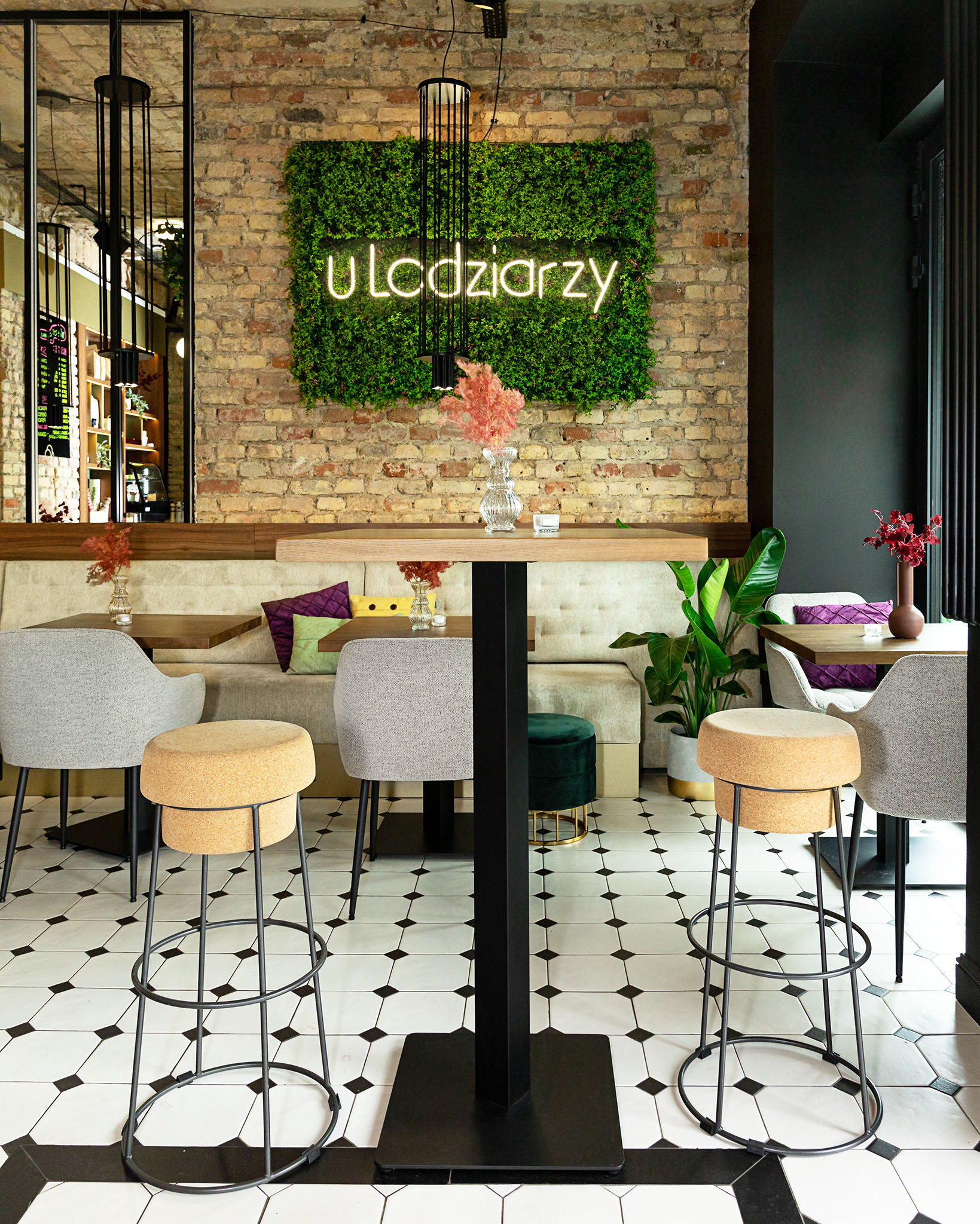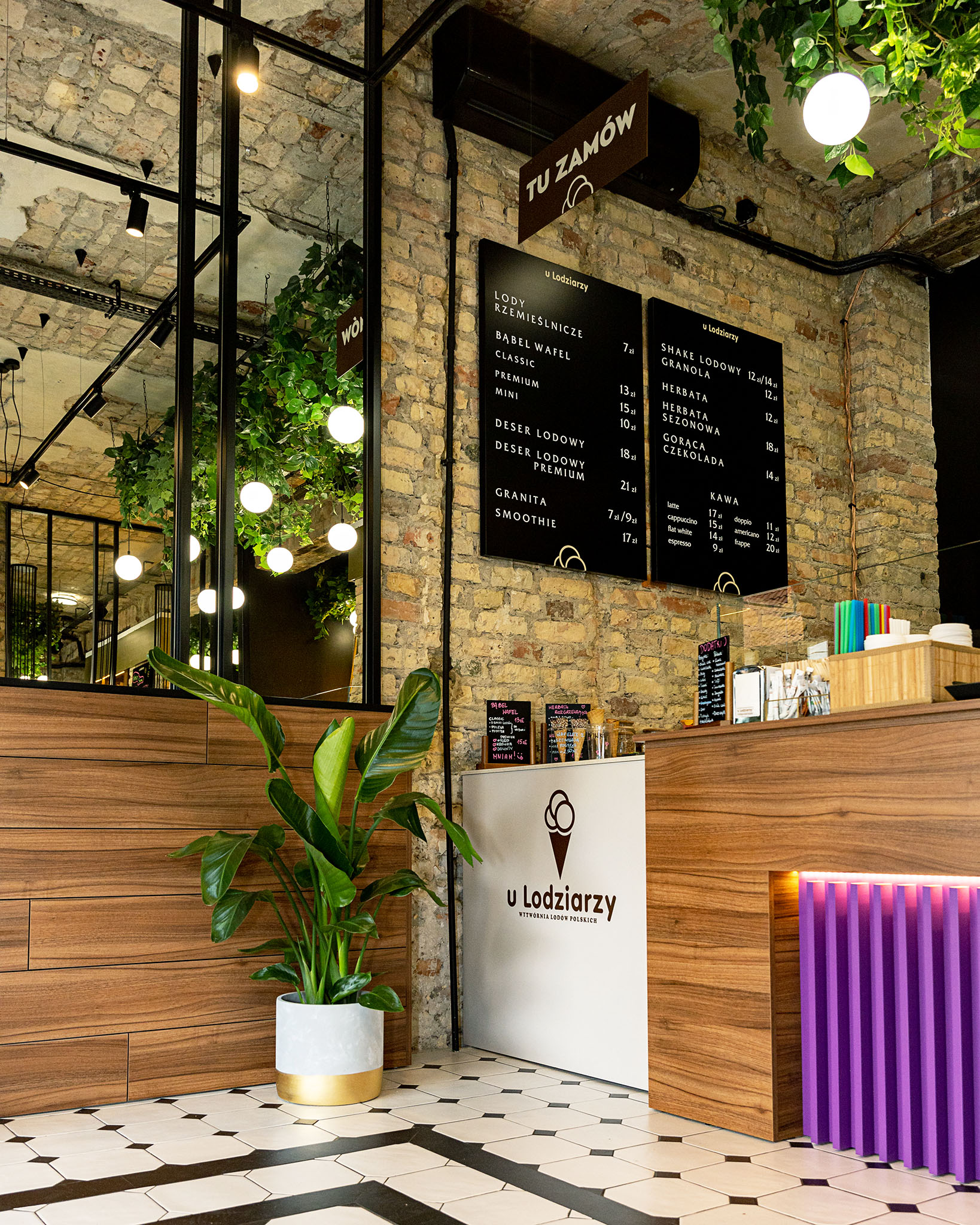 Lodziarnia „U Lodziarzy” to miejsce, gdzie tradycja spotyka nowoczesny design. Zastosowanie surowych cegieł, podłogi w szachownicę oraz soczystych akcentów kolorystycznych sprawiło, że wnętrze zyskało niepowtarzalny charakter.