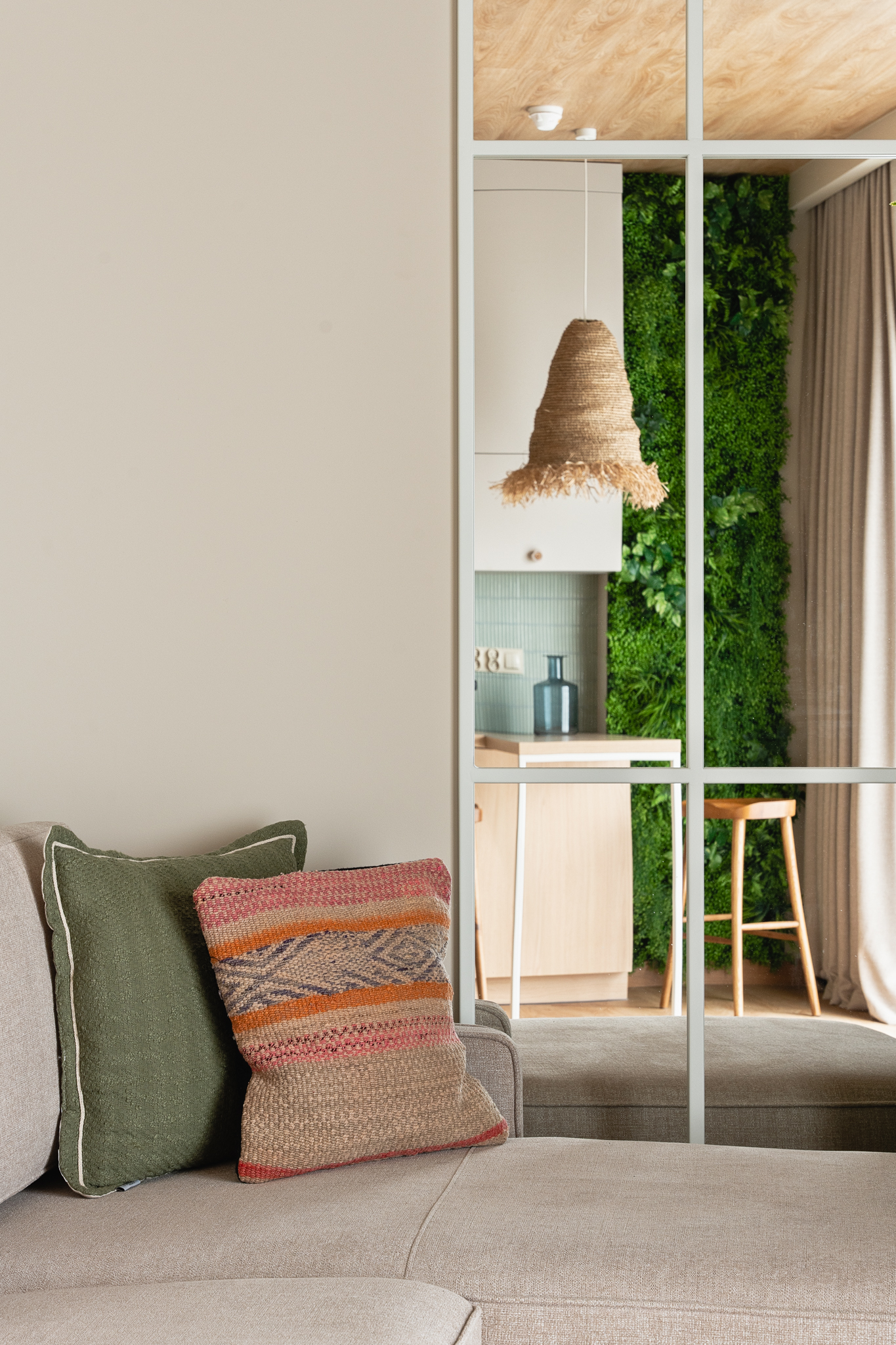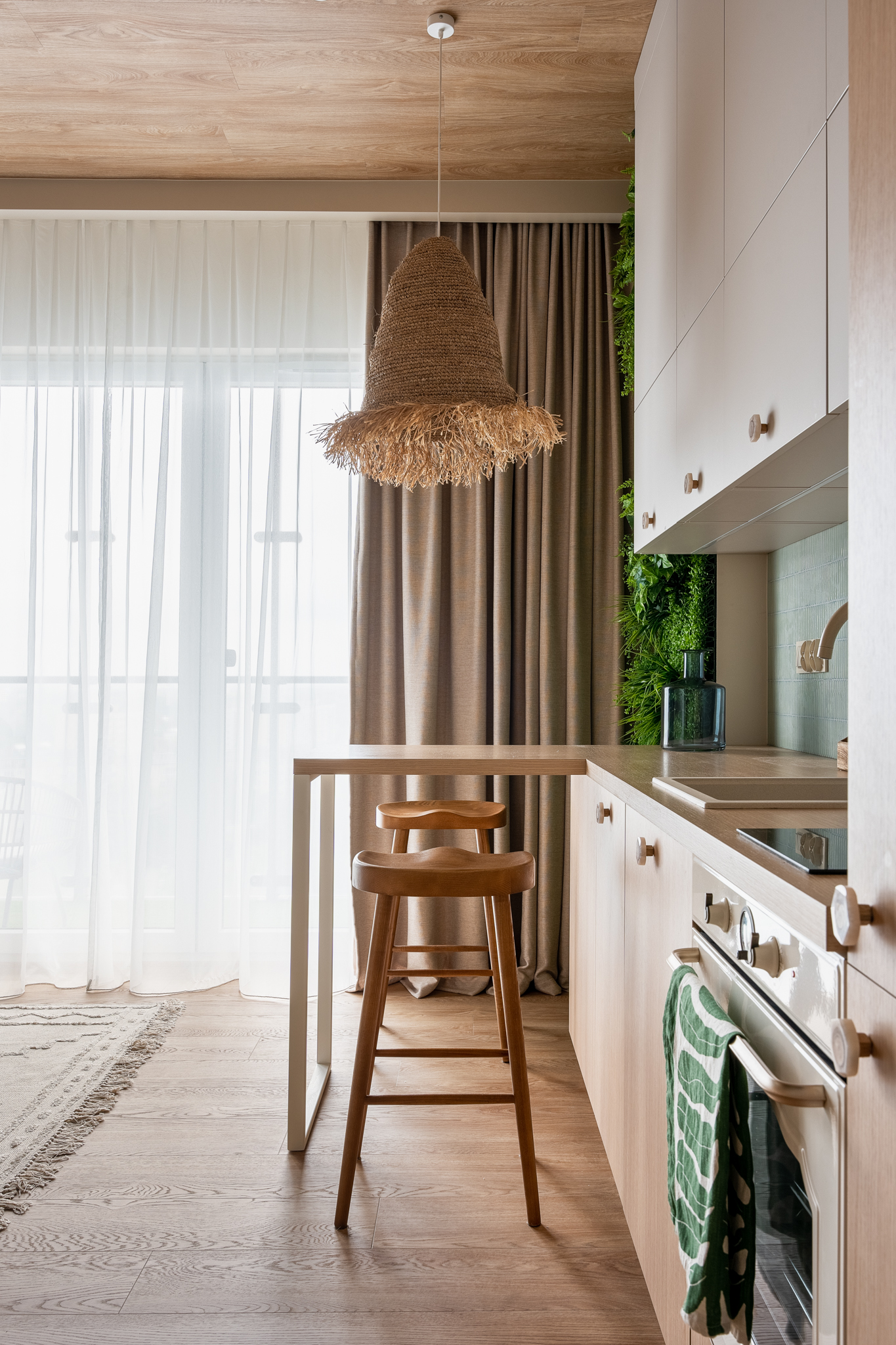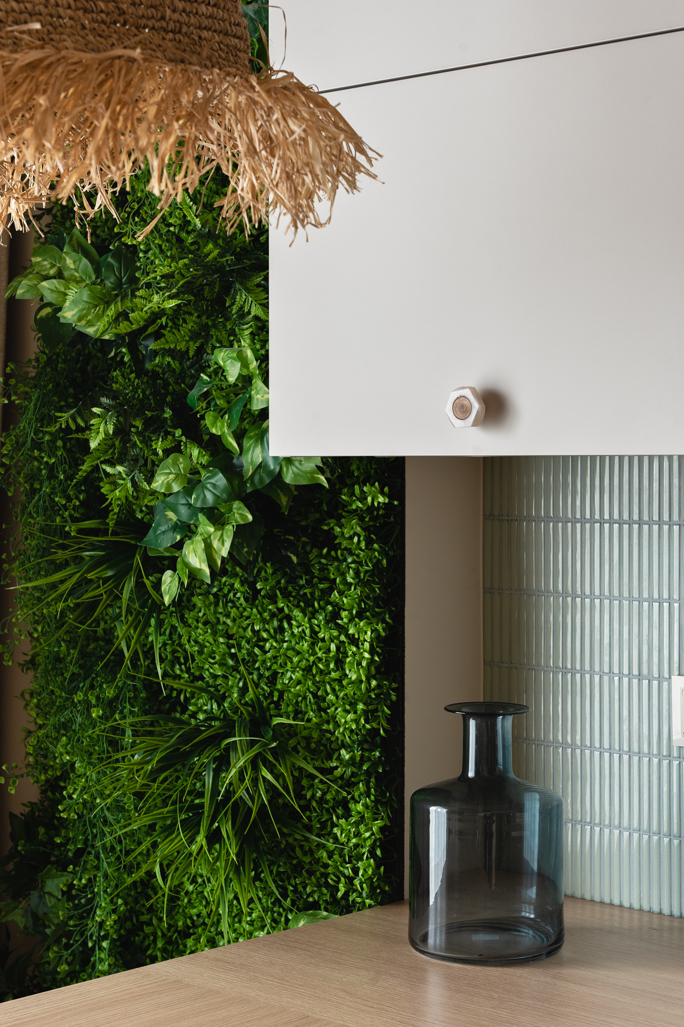 Naturalne materiały wprowadziły do wnętrza przyjemne ciepło i harmonię. Jasne kolory optycznie powiększyły przestrzeń, a zielone dodatki, inspirowane motywami dżungli, dodały całości nieco życia i energii. To miejsce, które pozwala na chwilę wytchnienia po długim dniu, jednocześnie będąc stylową wizytówką całego mieszkania.
