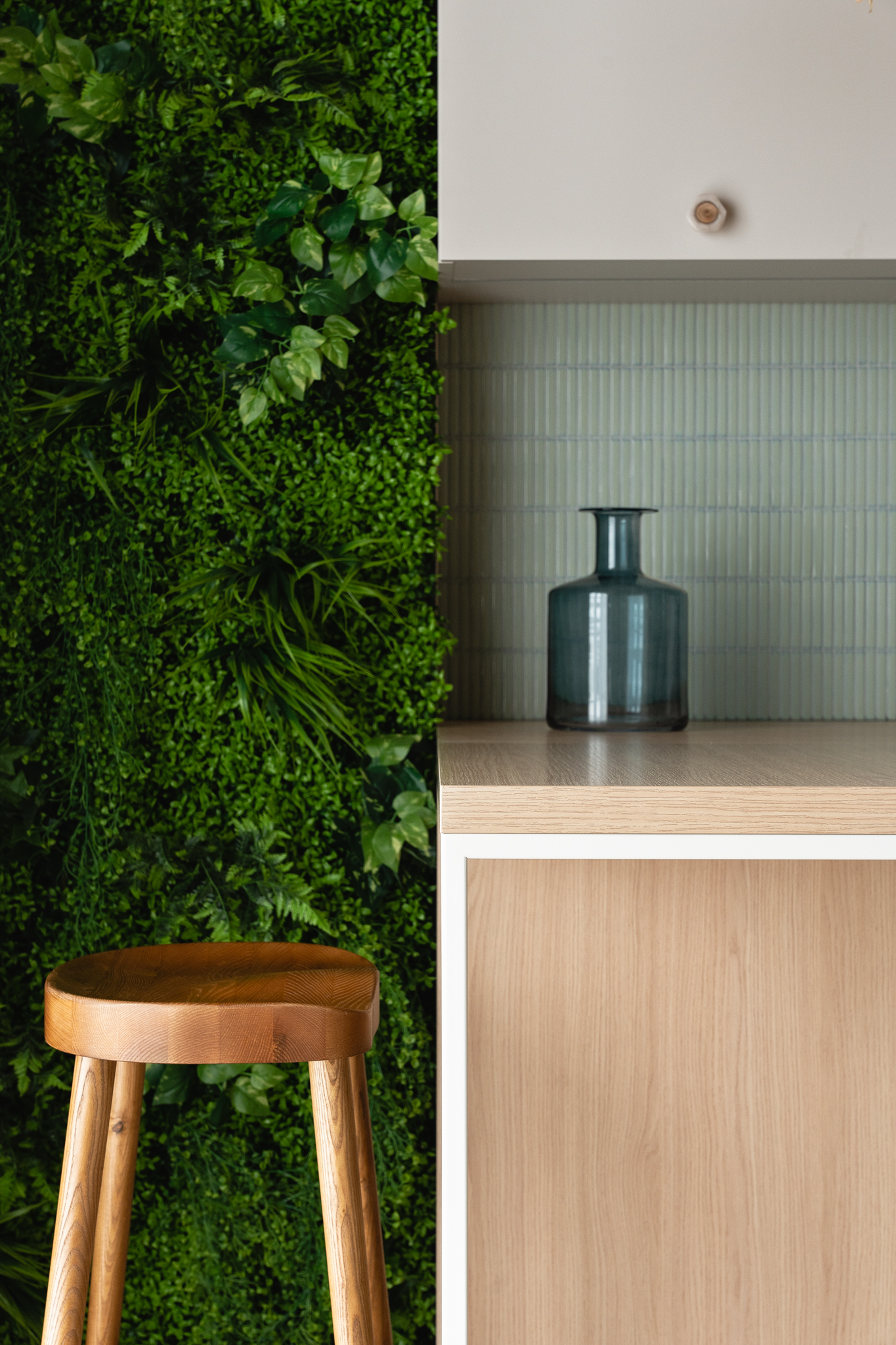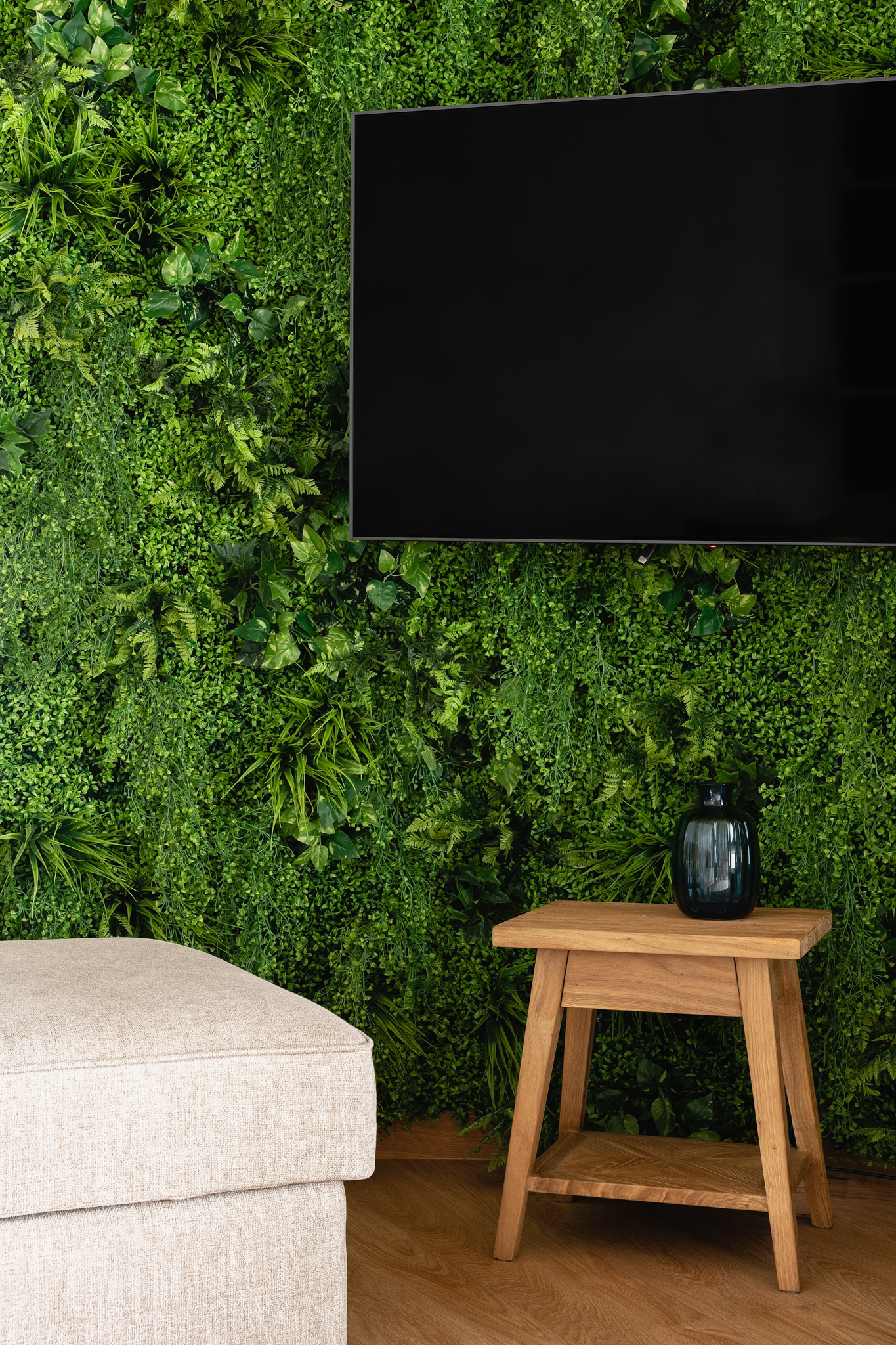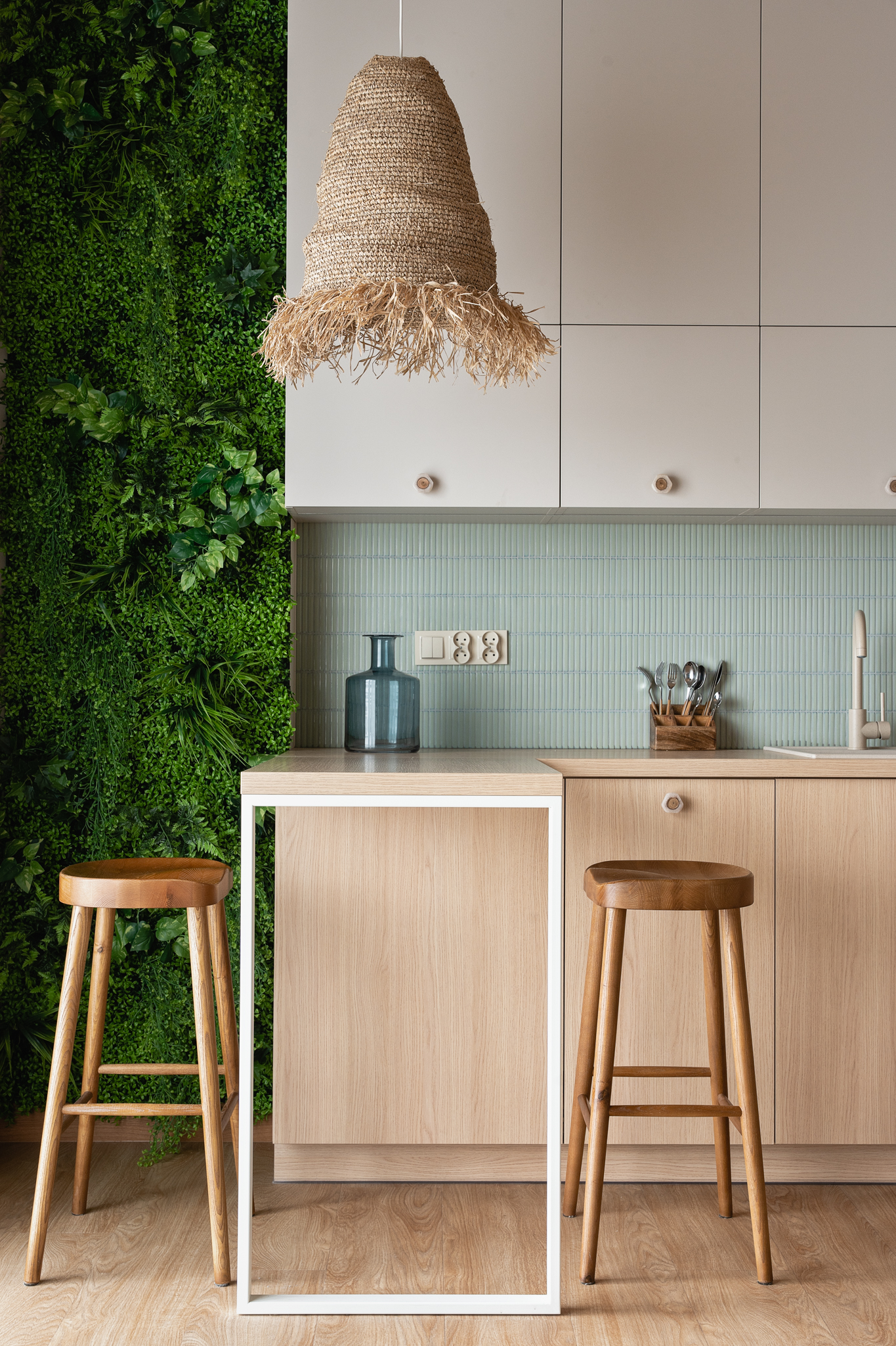 Naturalne materiały wprowadziły do wnętrza przyjemne ciepło i harmonię. Jasne kolory optycznie powiększyły przestrzeń, a zielone dodatki, inspirowane motywami dżungli, dodały całości nieco życia i energii. To miejsce, które pozwala na chwilę wytchnienia po długim dniu, jednocześnie będąc stylową wizytówką całego mieszkania.
