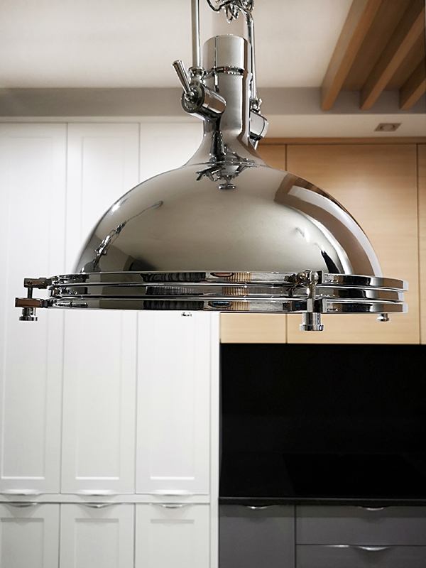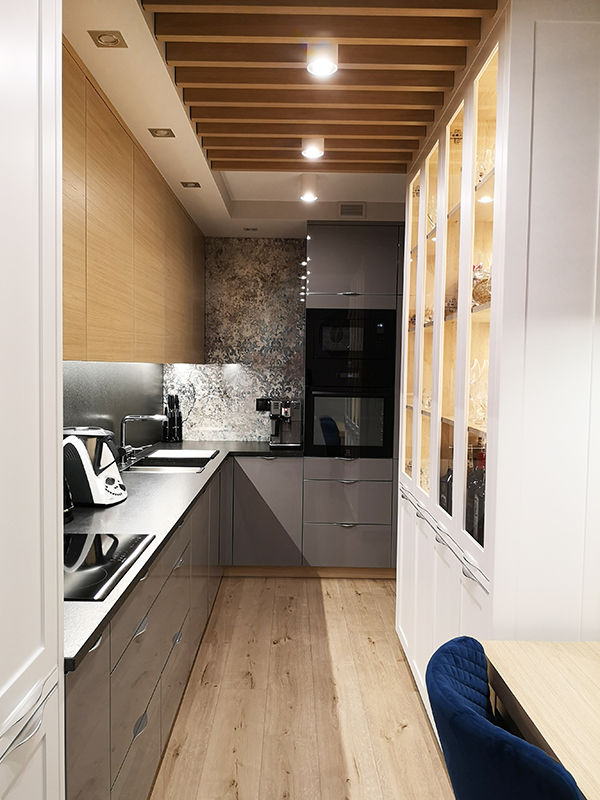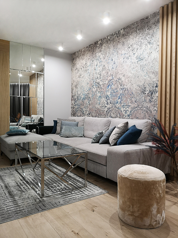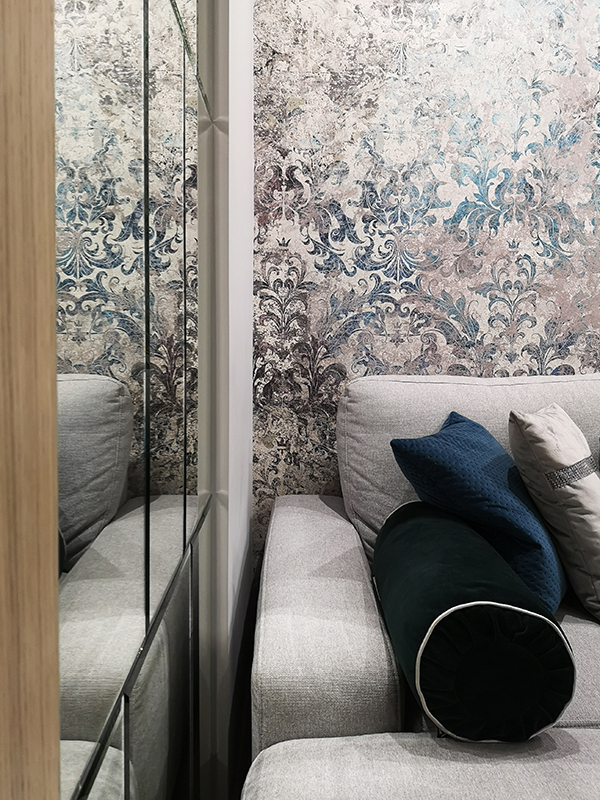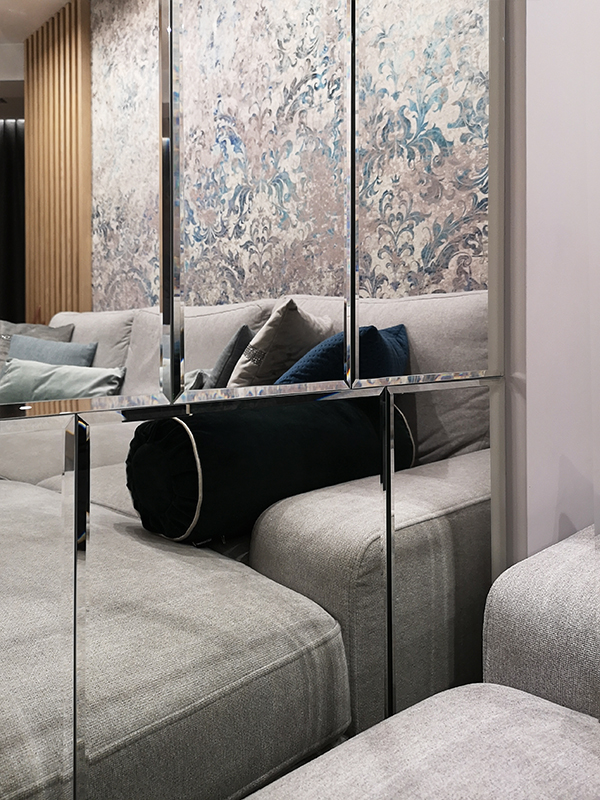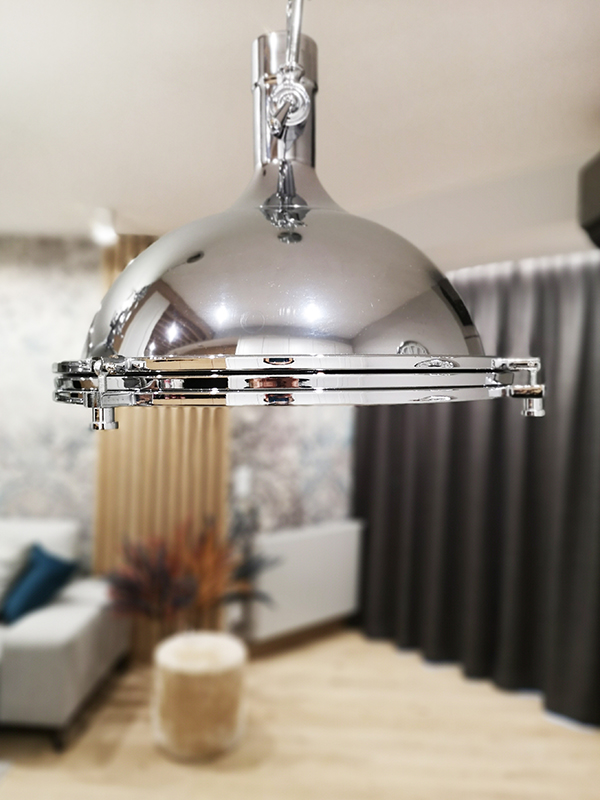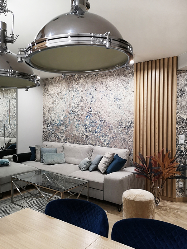 Projekt utrzymany jest w nowoczesnym stylu, z dominacją prostych form i akcentami w kolorze chromu. Paleta barw opiera się na odcieniach błękitu i granatu, które doskonale współgrają z lustrzanymi powierzchniami, powiększającymi optycznie przestrzeń.