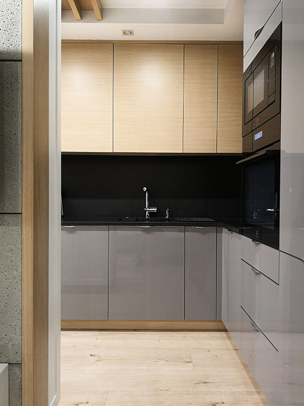 Kluczowym założeniem projektu było powiększenie części dziennej oraz łazienki. W tym celu wyburzyliśmy ściany działowe i zreorganizowaliśmy przestrzeń. Dzięki temu mieszkanie zyskało na funkcjonalności i przestronności. Kuchnia stała się bardziej komfortowa, a łazienka pomimo niewielkiego metrażu oferuje teraz wszystko, czego potrzeba do wygodnego użytkowania.