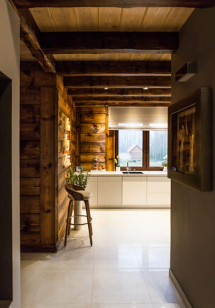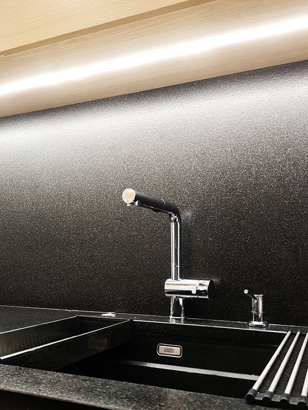Wszystkie zabudowy stolarskie zostały wykonane na zamówienie. W kuchni na blacie dominuje kamień, który płynnie przechodzi na ścianę między szafkami, nadając wnętrzu elegancki charakter. Ten naturalny materiał nie tylko przyciąga wzrok, ale jest też niezwykle praktyczny i odporny na codzienne użytkowanie.