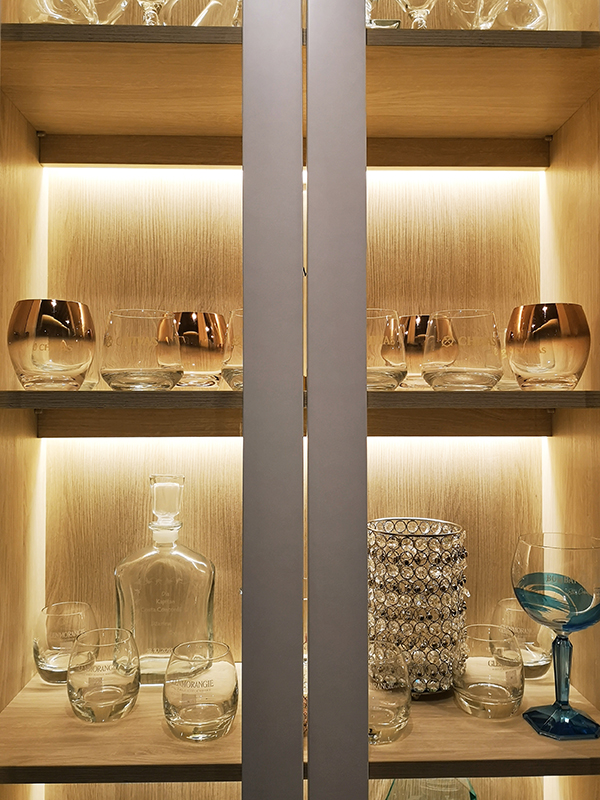 Aby zachować podział na strefy bez rezygnowania z poczucia przestrzeni, oddzieliliśmy salon od jadalni przeszkloną witryną. Pozwoliło to stworzyć spójną, ale wyraźnie zorganizowaną przestrzeń dzienną.