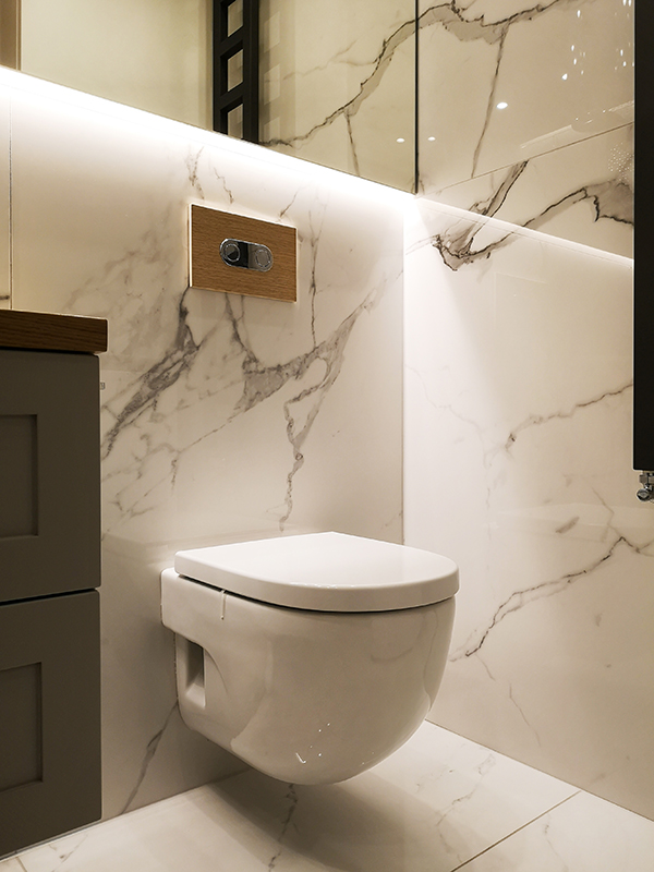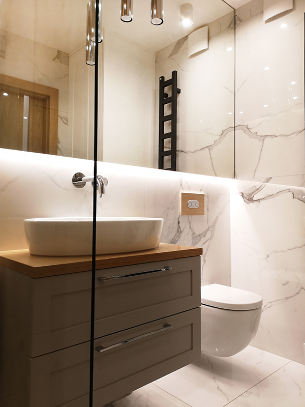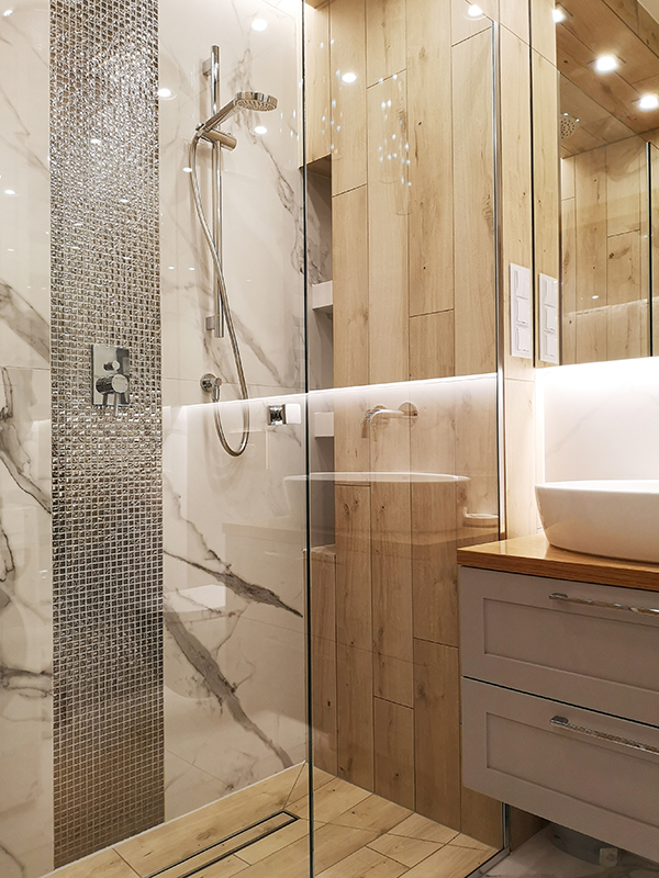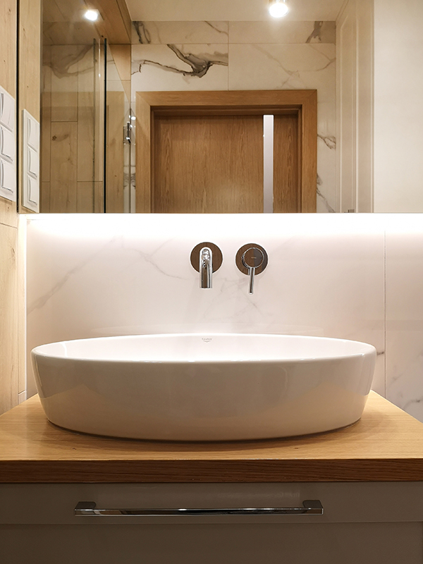 W łazience połączyliśmy płytki inspirowane marmurem z gresem imitującym drewno, tworząc harmonijny kontrast. Duże lustro na całej szerokości ściany dodaje przestronności. Na niewielkim metrażu udało się zmieścić przestronny prysznic (140 cm szerokości) oraz zabudowę z miejscem na pralkę i dodatkowe przechowywanie.